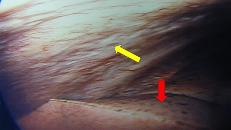 Αυτή είναι μια φωτογραφία μετά τοποθέτηση ενός τηλεσκοπίου μέσα στο θώρακα. Βλέπουμε το εσωτερικό του θώρακα και στο κάτω μέρος τον πνεύμονα με το κόκκινο βέλος, ενώ το κίτρινο βέλος μας δείχνει την περιοχή όλη που καλύπτει ο υπεζωκότας.